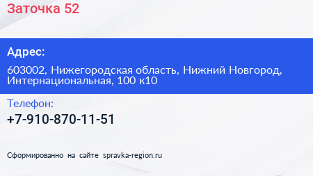Заточка 52 по адресу 603002, Нижегородская область, Нижний Новгород, Интернациональная, 100 к10 в дальнейшем Организация, размещена в следующих категориях: