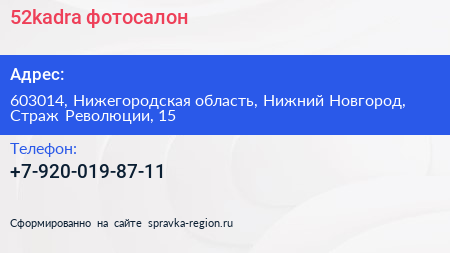 52kadra, фотосалон по адресу 603014, Нижегородская область, Нижний Новгород, Страж Революции, 15 в дальнейшем Организация, размещена в следующих категориях: