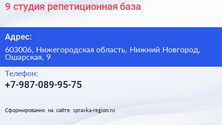 9 студия, репетиционная база по адресу 603006, Нижегородская область, Нижний Новгород, Ошарская, 9 в дальнейшем Организация, размещена в следующих категориях: