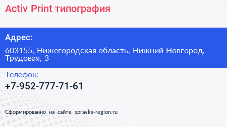 Activ Print, типография по адресу 603155, Нижегородская область, Нижний Новгород, Трудовая, 3 в дальнейшем Организация, размещена в следующих категориях: