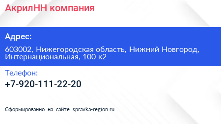 АкрилНН, компания по адресу 603002, Нижегородская область, Нижний Новгород, Интернациональная, 100 к2 в дальнейшем Организация, размещена в следующих категориях: