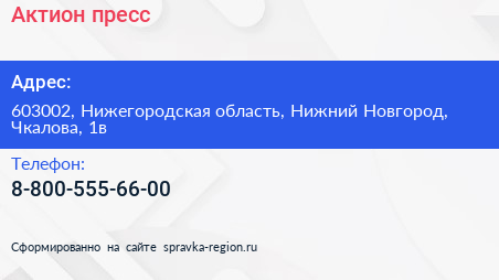 Актион-пресс по адресу 603002, Нижегородская область, Нижний Новгород, Чкалова, 1в в дальнейшем Организация, размещена в следующих категориях: