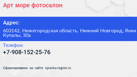 Арт-море, фотосалон по адресу 603142, Нижегородская область, Нижний Новгород, Янки Купалы, 30а в дальнейшем Организация, размещена в следующих категориях: