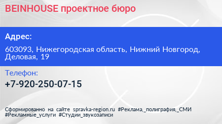 BEINHOUSE, проектное бюро по адресу 603093, Нижегородская область, Нижний Новгород, Деловая, 19 в дальнейшем Организация, размещена в следующих категориях:
