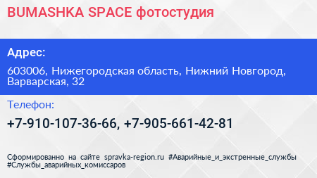 BUMASHKA SPACE, фотостудия по адресу 603006, Нижегородская область, Нижний Новгород, Варварская, 32 в дальнейшем Организация, размещена в следующих категориях: