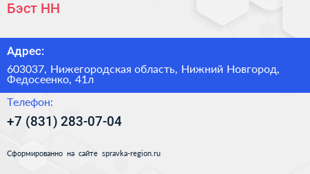 Бэст-НН по адресу 603037, Нижегородская область, Нижний Новгород, Федосеенко, 41л в дальнейшем Организация, размещена в следующих категориях: