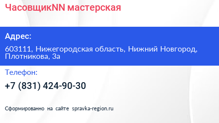 ЧасовщикNN, мастерская по адресу 603111, Нижегородская область, Нижний Новгород, Плотникова, 3а в дальнейшем Организация, размещена в следующих категориях: