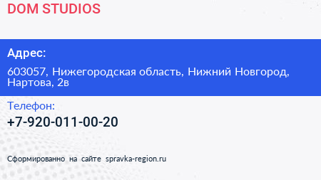 DOM STUDIOS по адресу 603057, Нижегородская область, Нижний Новгород, Нартова, 2в в дальнейшем Организация, размещена в следующих категориях: