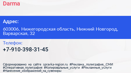 Darma по адресу 603006, Нижегородская область, Нижний Новгород, Варварская, 32 в дальнейшем Организация, размещена в следующих категориях: