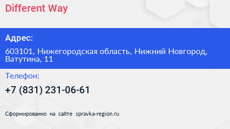 Different Way по адресу 603101, Нижегородская область, Нижний Новгород, Ватутина, 11 в дальнейшем Организация, размещена в следующих категориях:
