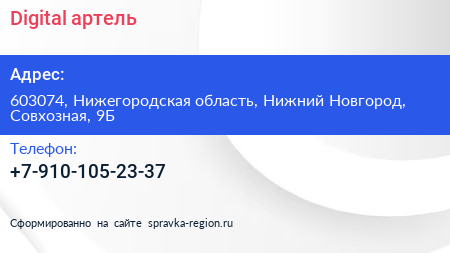 Digital-артель по адресу 603074, Нижегородская область, Нижний Новгород, Совхозная, 9Б в дальнейшем Организация, размещена в следующих категориях: