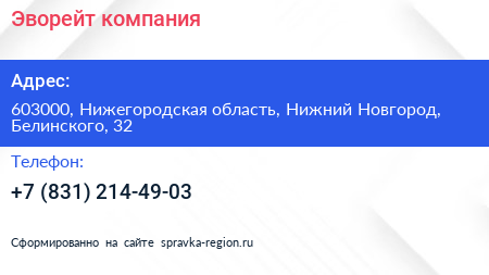 Эворейт, компания по адресу 603000, Нижегородская область, Нижний Новгород, Белинского, 32 в дальнейшем Организация, размещена в следующих категориях: