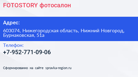 FOTOSTORY, фотосалон по адресу 603074, Нижегородская область, Нижний Новгород, Бурнаковская, 51а в дальнейшем Организация, размещена в следующих категориях: