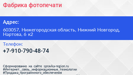 Фабрика фотопечати по адресу 603057, Нижегородская область, Нижний Новгород, Нартова, 6 к2 в дальнейшем Организация, размещена в следующих категориях: