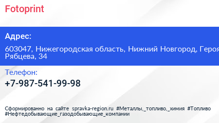 Fotoprint по адресу 603047, Нижегородская область, Нижний Новгород, Героя Рябцева, 34 в дальнейшем Организация, размещена в следующих категориях: