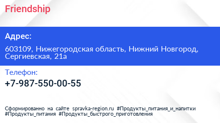Friendship по адресу 603109, Нижегородская область, Нижний Новгород, Сергиевская, 21а в дальнейшем Организация, размещена в следующих категориях: