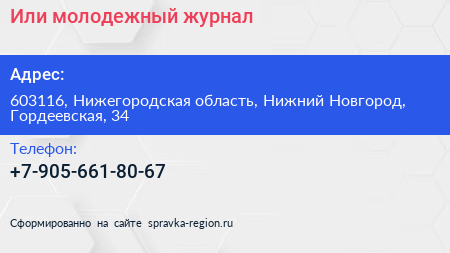 Или, молодежный журнал по адресу 603116, Нижегородская область, Нижний Новгород, Гордеевская, 34 в дальнейшем Организация, размещена в следующих категориях: