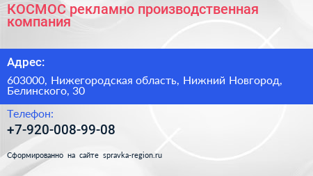 КОСМОС, рекламно-производственная компания по адресу 603000, Нижегородская область, Нижний Новгород, Белинского, 30 в дальнейшем Организация, размещена в следующих категориях: