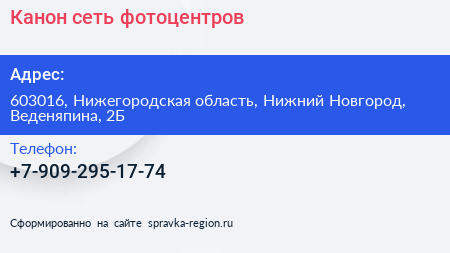 Канон, сеть фотоцентров по адресу 603016, Нижегородская область, Нижний Новгород, Веденяпина, 2Б в дальнейшем Организация, размещена в следующих категориях: