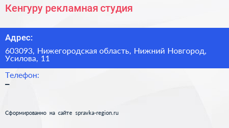 Кенгуру, рекламная студия по адресу 603093, Нижегородская область, Нижний Новгород, Усилова, 11 в дальнейшем Организация, размещена в следующих категориях: