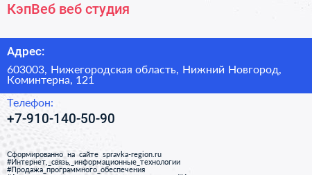 КэпВеб, веб-студия по адресу 603003, Нижегородская область, Нижний Новгород, Коминтерна, 121 в дальнейшем Организация, размещена в следующих категориях: