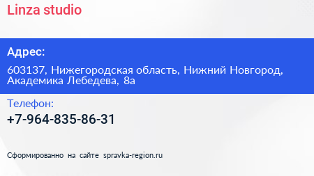 Linza studio по адресу 603137, Нижегородская область, Нижний Новгород, Академика Лебедева, 8а в дальнейшем Организация, размещена в следующих категориях: