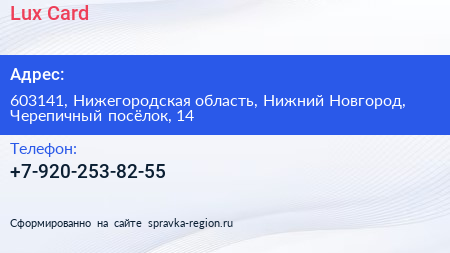 Lux-Card по адресу 603141, Нижегородская область, Нижний Новгород, Черепичный посёлок, 14 в дальнейшем Организация, размещена в следующих категориях: