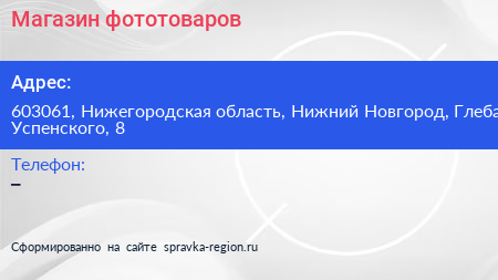 Магазин фототоваров по адресу 603061, Нижегородская область, Нижний Новгород, Глеба Успенского, 8 в дальнейшем Организация, размещена в следующих категориях: