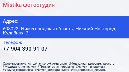 Mistika, фотостудия по адресу 603022, Нижегородская область, Нижний Новгород, Кулибина, 3 в дальнейшем Организация, размещена в следующих категориях: