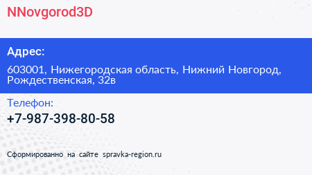 NNovgorod3D по адресу 603001, Нижегородская область, Нижний Новгород, Рождественская, 32в в дальнейшем Организация, размещена в следующих категориях: