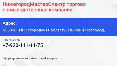 НижегородМастерСпектр, торгово-производственная компания по адресу 603098, Нижегородская область, Нижний Новгород, в дальнейшем Организация, размещена в следующих категориях:
