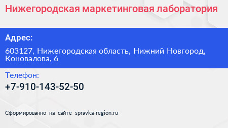 Нижегородская маркетинговая лаборатория по адресу 603127, Нижегородская область, Нижний Новгород, Коновалова, 6 в дальнейшем Организация, размещена в следующих категориях: