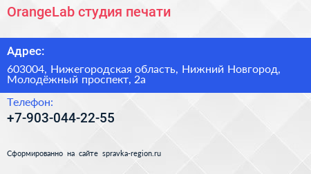 OrangeLab, студия печати по адресу 603004, Нижегородская область, Нижний Новгород, Молодёжный проспект, 2а в дальнейшем Организация, размещена в следующих категориях: