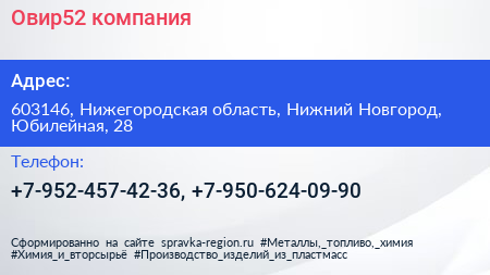 Овир52, компания по адресу 603146, Нижегородская область, Нижний Новгород, Юбилейная, 28 в дальнейшем Организация, размещена в следующих категориях: