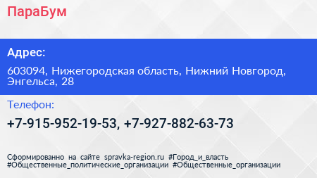 ПараБум по адресу 603094, Нижегородская область, Нижний Новгород, Энгельса, 28 в дальнейшем Организация, размещена в следующих категориях: