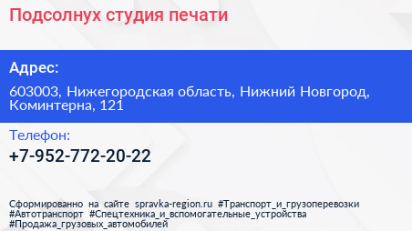 Подсолнух, студия печати по адресу 603003, Нижегородская область, Нижний Новгород, Коминтерна, 121 в дальнейшем Организация, размещена в следующих категориях: