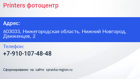 Printers, фотоцентр по адресу 603033, Нижегородская область, Нижний Новгород, Движенцев, 2 в дальнейшем Организация, размещена в следующих категориях: