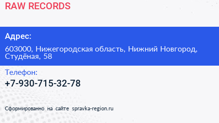 RAW RECORDS по адресу 603000, Нижегородская область, Нижний Новгород, Студёная, 58 в дальнейшем Организация, размещена в следующих категориях: