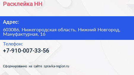 Расклейка-НН по адресу 603086, Нижегородская область, Нижний Новгород, Мануфактурная, 16 в дальнейшем Организация, размещена в следующих категориях: