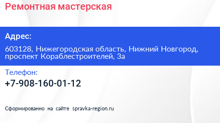 Ремонтная мастерская по адресу 603128, Нижегородская область, Нижний Новгород, проспект Кораблестроителей, 3а в дальнейшем Организация, размещена в следующих категориях: