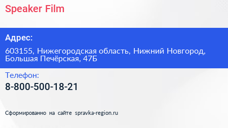 Speaker Film по адресу 603155, Нижегородская область, Нижний Новгород, Большая Печёрская, 47Б в дальнейшем Организация, размещена в следующих категориях: