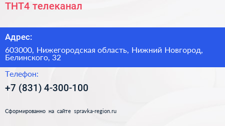 ТНТ4, телеканал по адресу 603000, Нижегородская область, Нижний Новгород, Белинского, 32 в дальнейшем Организация, размещена в следующих категориях: