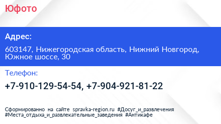 Юфото по адресу 603147, Нижегородская область, Нижний Новгород, Южное шоссе, 30 в дальнейшем Организация, размещена в следующих категориях: