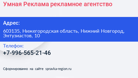 Умная Реклама, рекламное агентство по адресу 603135, Нижегородская область, Нижний Новгород, Энтузиастов, 10 в дальнейшем Организация, размещена в следующих категориях: