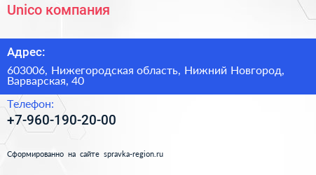 Unico, компания по адресу 603006, Нижегородская область, Нижний Новгород, Варварская, 40 в дальнейшем Организация, размещена в следующих категориях: