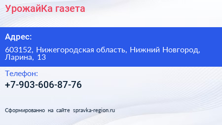УрожайКа, газета по адресу 603152, Нижегородская область, Нижний Новгород, Ларина, 13 в дальнейшем Организация, размещена в следующих категориях: