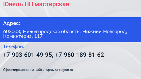 Ювель-НН, мастерская по адресу 603003, Нижегородская область, Нижний Новгород, Коминтерна, 117 в дальнейшем Организация, размещена в следующих категориях: