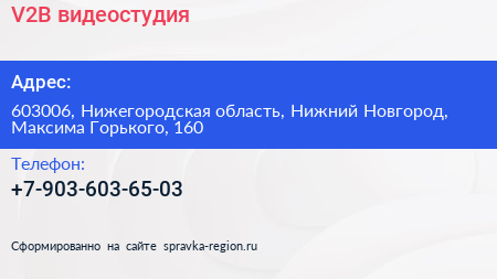 V2B, видеостудия по адресу 603006, Нижегородская область, Нижний Новгород, Максима Горького, 160 в дальнейшем Организация, размещена в следующих категориях: