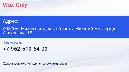 Wax.Only по адресу 603006, Нижегородская область, Нижний Новгород, Ошарская, 15 в дальнейшем Организация, размещена в следующих категориях: