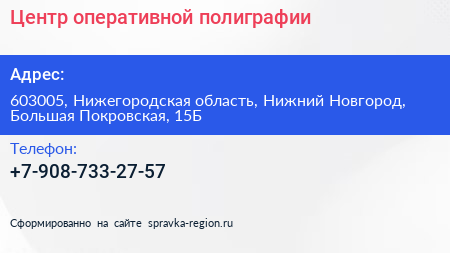 Центр оперативной полиграфии по адресу 603005, Нижегородская область, Нижний Новгород, Большая Покровская, 15Б в дальнейшем Организация, размещена в следующих категориях: